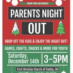 Drop off the kids and enjoy a parent’s night out! On Saturday, December 14th, First Christian Church will host “Parents Night Out” from 3:00 pm to 5:00 pm, an event of games, crafts, and snacks for local youth giving parents the opportunity to have dinner, go holiday shopping, or just have a break off from… Read More »